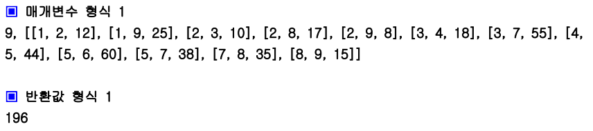 System.out.println(T.solution(6, new int[][]{{1, 2, 12}, {1, 3, 4},