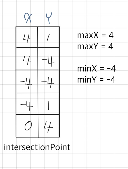 - 교점 리스트 중 최대 x, y, 최소 x, y 구하기