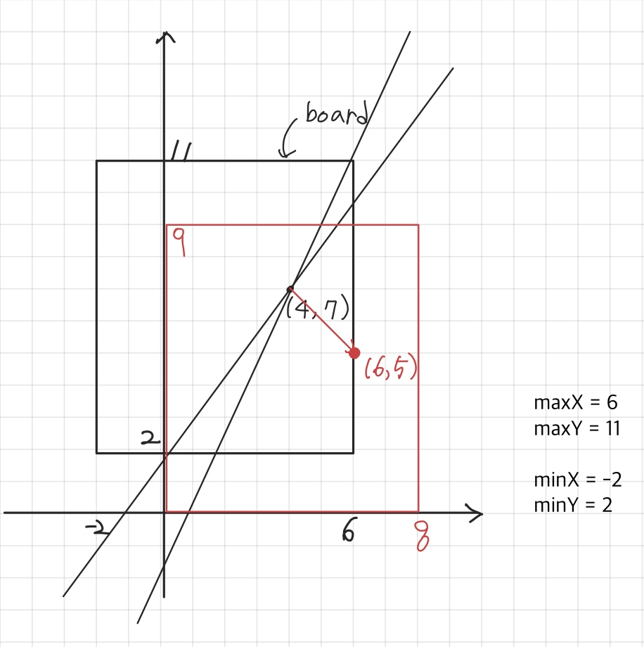 boolean[][] board = new boolean[(int) (maxY - minY + 1)][(int) (maxX - minX + 1)]; // height, width