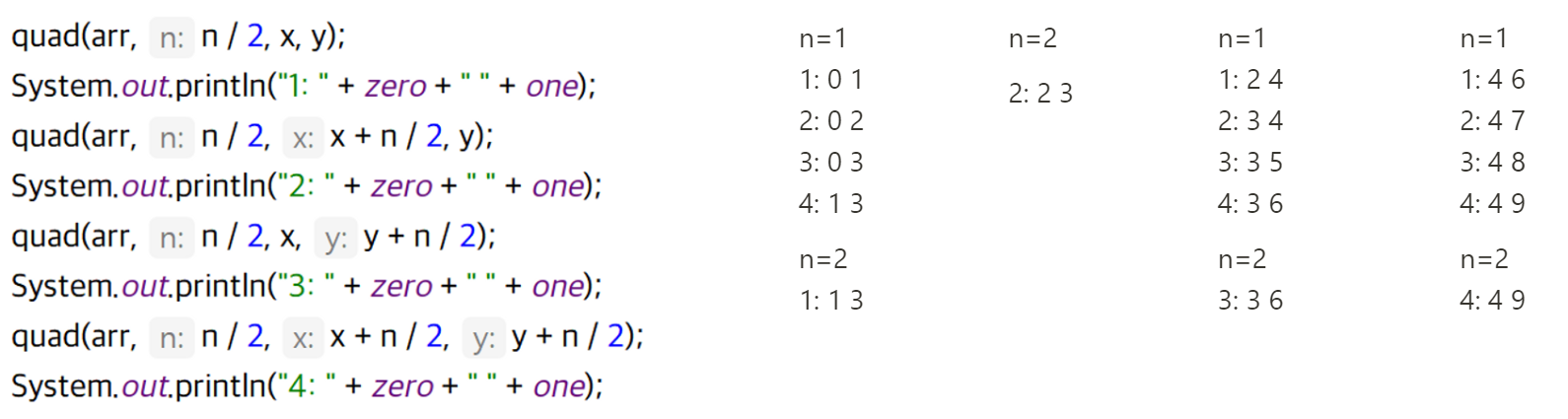 quad(arr, n / 2, x + n / 2, y); // n/2 크기로 분할하여 오른쪽 위 위치 탐색