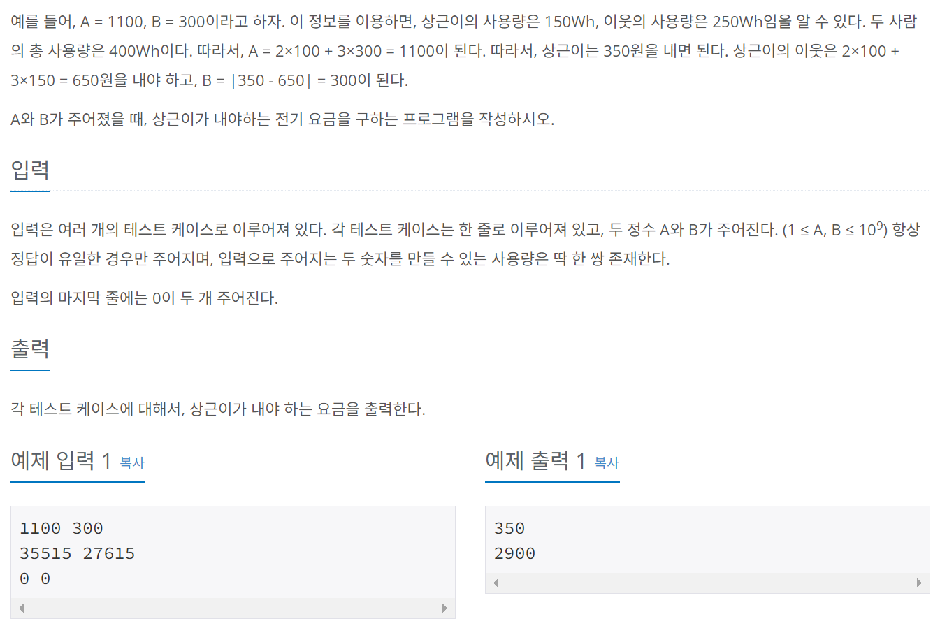 x + y = 400 | watt(x) - watt(y) | = 300 ( x, y : 상근이와 이웃의 사용량 )