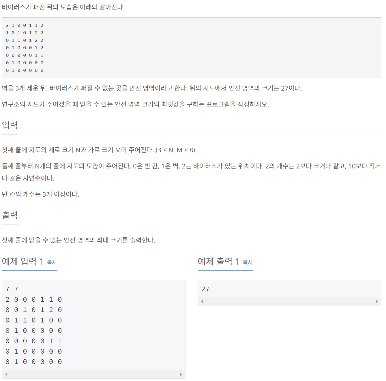 // 벽 세울 세 곳 정하고 (DFS) 바이러스 퍼지고 나서(BFS) 최댓값 갱신 ?